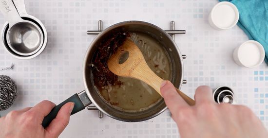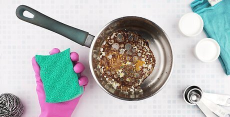 Clean stuck-on food. Fill your pan with about 1 inch of water and put it on a stove burner. Turn the stove on, and wait for the water to boil. Once the water is boiling, add 2 tablespoons of salt, or 1 tablespoon of baking soda. Put the stove flame on low/medium low, and let this mixture lightly boil for approximately 30 minutes.