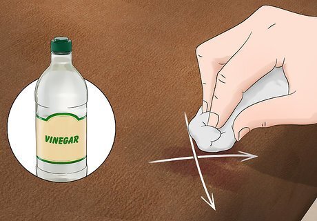Remove stains with white vinegar or a suede cleaning product. Dip a terry cloth in white vinegar or suede cleaner. Begin to rub the stain in a criss-cross motion. Rubbing in a circular motion can cause the suede to darken. Once the stain has lifted, allow the suede to air dry.