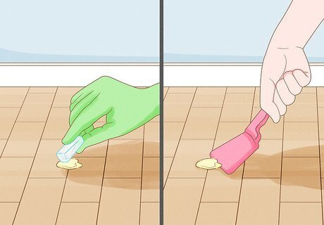 Dab away stains like ink, nail polish, or lipstick with rubbing alcohol. Wet a cotton ball with rubbing alcohol, then dab it directly onto the stain. Once the stain lifts, clean the area with warm water, then dry it. Make sure you only apply it to the stain itself, as alcohol can dull the finish of your laminate flooring. Acetone can be used sparingly for very stubborn stains.