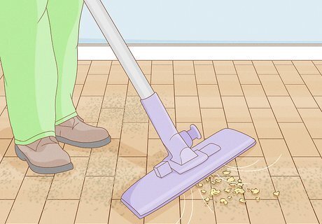 Vacuum the floor. Alternatively, you can remove dust and dirt daily by using a vacuum. You must ensure that your vacuum does not have a “beater bar,” also called a “bristle bar,” that can damage your floor. Also, if possible, you should set your vacuum to a “wood floor” setting. A "beater bar" is a spinning bar with bristles. Look at the bottom of your vacuum to determine the presence of a "beater bar." Look for a vacuum with a wood floor setting.
