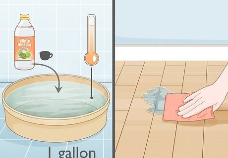 Dilute vinegar. If you need something a little more powerful than plain water, try adding white vinegar to hot water. This can be a slightly more powerful (though still gentle) way to remove dirt and grime from your laminate floors. Add ½ cup of white vinegar to 1 gallon of hot water. You can add a few drops of lavender essential oil for a nice smell.