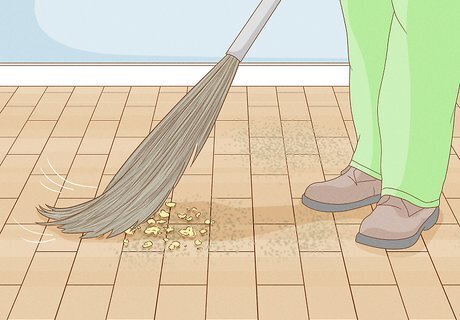 Sweep the floor. In order to maintain your wood laminate floor, you must remove any dirt or dust every day. Focus on high-traffic areas and locations near exits, where dirt can accumulate. Avoid using a traditional dry broom. The bristles could scratch the surface of your floors. Instead, opt for a dry dust mop or dry Swiffer.