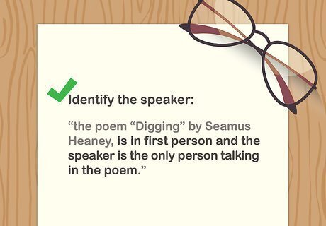 Identify the mode of address. See if the poems are talking in first, second, or third person. Notice if you are meant to assume the author is the poem's speaker, or if the speaker of the poem is a fictional or historical character. Also, consider if the poem has a named or unnamed recipient or if it is directed at an object or event. If the poems you are comparing use very different modes of address, note the way that it changes their engagement with the theme. For instance, if you are reading 2 poems about spiritual epiphanies, and one is written from the perspective of an observer, while the other is from the perspective of the poet, you are likely to notice feeling more detached curiosity about the former, and more of an emotional, personal feeling about the latter. Some poems might address you as a reader, refer to the author as the author, or talk about their own composition and intentions. Note how this self-aware style differentiates the poem from a more "transparent," self-contained poem.