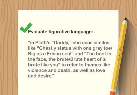 Evaluate metaphors, similes, and other figurative language. Figurative language uses words in non-literal ways to give the reader a feeling or an image. For instance, when Joan Murray writes, "my love is a mist of stars," she does not mean her love is actually an inhuman cloud of elements. Instead, she is trying to communicate that the love is remote, idealized, impossible. Similes compare 2 unlike things using "like" or "as," as in Nazim Hikmet's line: "This world will grow cold…like an empty walnut shell." Metaphors compare 2 unlike things without using "like" or "as," as when Laura Riding describes her hair as "a scarf unwoven." Imagery uses the senses, describing something so that the reader can almost see, hear, feel, taste, or smell it, as in this startling image by Elizabeth Willis: "The devil does not speak to a witch. He only moves his tongue." Compare the uses of figurative language in the poems you are reading. If one poem uses a lot of metaphors, but the other a lot of similes, how does that affect you? The metaphor poem might feel more direct and powerful, while the simile poem might sound more academic or uncertain.