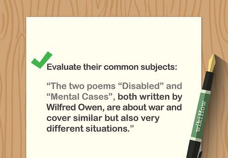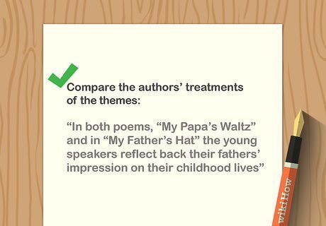 Compare the authors' treatments of the themes. After you've explained the initial similarities, go into more depth about the themes. For instance, you might explain how the poems are similar and different in their treatment of a shared subject. Share what you've noted about the authors and their different relationships to the subject, and note how the audience and mode of publication may have affected the author's presentations. For instance, Shakespeare depended on his wealthy patrons for financial support, so his treatment of a subject might be biased to flatter his patron.
