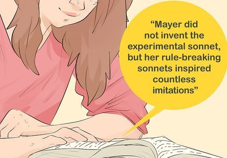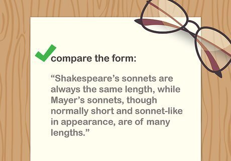 Contextualize the choice of form. If the poems you are reading are written in a traditional form, such as Shakespearean sonnets, Spencerian sonnets, ballads, haiku, senryu, or a ghazal, do some research about the history of the form! Notice any ways the poems conform or deviate from their traditional forms. Note if the poems are written in a form that sprang out of their time, a form that has been popularized since, or if the poet was the inventor of the form. For instance, if you were comparing a sonnet by Petrarch to a sonnet by Bernadette Mayer, you would need to give both of them credit for refining a form. Petrarch did not invent the Petrarchan sonnet, but rather popularized it. Bernadette Mayer did not invent the experimental sonnet, but her rule-breaking sonnets inspired countless imitations.