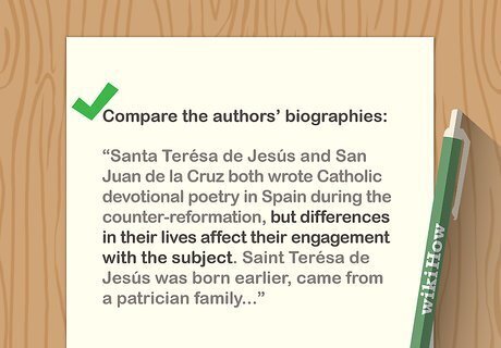 Compare the biographies of the authors. If you are comparing works by one author, look at the times they were written and see if you notice any new influences on the later works. If you are comparing poems from multiple authors, consider the differences between those authors. Think about the time and place the poems were written. If the poets are from the same time and place, consider the differences in the author's lives. For instance, Santa Terésa de Jesús and San Juan de la Cruz both wrote Catholic devotional poetry in Spain during the counter-reformation, but differences in their lives affect their engagement with the subject. Saint Terésa de Jesús was born earlier, came from a patrician family, and suffered illness and "ecstatic" encounters with God. Her visionary writings were a huge influence on San Juan de la Cruz, who joined the religious order based on her ideas, and wrote his own versions of many of her poems. Therefore, if you are comparing Santa Terésa's "Vivo sin vivir en mí," and the parallel poem by San Juan, "Coplas por un alma que pena por ver a Dios," you would note that "Coplas" came second, and you might note that while the lines are more complex, they lack the passionate immediacy of "Vivo."
