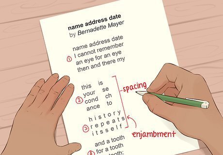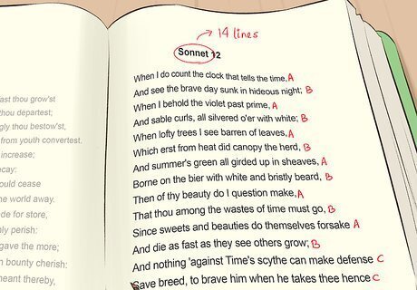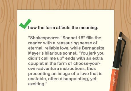 Learn the conventions of the traditional forms if that applies. If you are working with poems written to conform to certain formal conventions, like sonnets, haiku, or pantoums, look up the line count, rhyme pattern, and other aspects of the form. Notice if the poems you are working with include all the traditional aspects. If you know you are working with a Shakespearean sonnet, for instance, you will know that the poem has 14 lines, 3 ABAB rhymes, and a final rhymed pair. It will not have stanzas, but will be presented as a block. Keep in mind that the Shakespearean or English sonnet differs from the Italian or Petrarchan sonnet. Determine which type your sonnet is before you continue. If you are working with a poem that does not appear to be in a traditional form, just take notes on its lines and stanzas. Consider how the poem's form might impact its content.