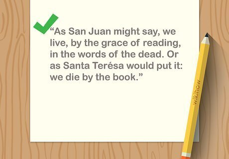 End by summarizing the comparisons. At this point, you should be able to distill your comparisons to a few pithy sentences. End by including an observation that turns in toward one of your previous points, or out toward a further application of your ideas. For instance, if you were writing about Etel Adnan and David Larsen's poems, you might turn outward at the end of your essay by describing painters who have included poetry in their paintings. If you are writing about style differences between Santa Terésa de Jesús and San Juan de la Cruz, you might turn in by phrasing something in the manner of both authors: "As San Juan might say, we live, by the grace of reading, in the words of the dead. Or as Santa Terésa would put it: we die by the book."