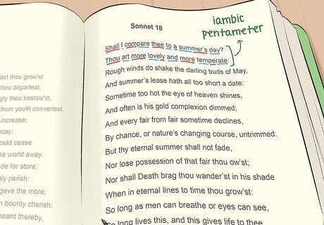 Scan the meter of each poem. In poetry, meter is the pattern of stressed and unstressed syllables in a line of poetry: in other words, it is the rhythm of the poem. A combination of stressed and unstressed syllables that repeats is called a foot. There are different types of feet, such as the iamb, dactyl, and trochee. If you're not sure a poem has a clear meter, read it aloud. If your voice sounds sing-song or marching, there is probably a regular meter. However, keep in mind that determining the meter of a poem can be difficult. Look up examples if you are unsure. Even if a poem doesn't have a regular rhythm, it can still be rhythmic. The poet is likely using a mixture of different poetic feet. The most famous poetic foot in English is the iamb, which is 1 unstressed and 1 stressed syllable. For instance, "Japan" is an iamb. A line of five iambs is called "iambic pentameter, as in Shakespeare's "Sonnet 18": "Shall I compare thee to a summer's day."