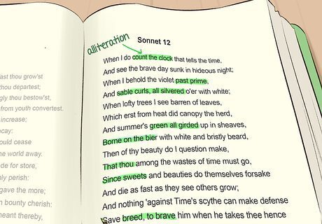 Listen for assonance and alliteration within lines. Assonance is the repetition of vowel sounds, as in "hear the mellow wedding bells." Alliteration is the repetition of consonant sounds, as in "two tigers." Both of these features can improve the musicality of a poem. Assonance and alliteration can be subtle, and does not always occur in adjacent words. For instance, Alli Warren's poem "Breadwinning for Birds" includes both assonance and alliteration in its title. The repeated "b"s and "d"s are examples of alliteration, while the repeated "i" sound is an example of assonance.