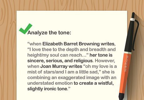 Analyze the tone. Two poems about related subjects may take entirely different tones, or attitudes. For instance, one may be hushed and reverential on a subject that for another is the butt of a joke. For instance, one love poem might promise undying love to a nearly-perfect beloved, while another laughingly exaggerates these tendencies. For instance, when Elizabeth Barrett Browning writes, "I love thee to the depth and breadth and height/my soul can reach, when feeling out of sight/of the ends of being…" her tone is sincere, serious, and religious. However, when Joan Murray writes "oh my love is a mist of stars/and I am a little sad," she is combining an exaggerated image with an understated emotion to create a wistful, slightly ironic tone. Notice how formal choices affect tone. For instance, in these lines by CA Conrad, the sudden capitalization of "Darling" implies sarcasm instead of affection: "you think Oscar Wilde was funny/well Darling I think he was busy/distracting straight people/so they would not kill him."