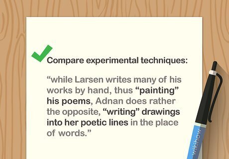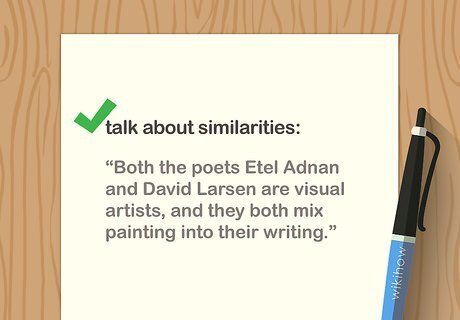 Begin talking about the similarities. You won't be comparing poems that have absolutely nothing in common: there is a reason that you are looking at these works together, so introduce your topic by establishing the common ground. You may describe their formal similarities, their thematic ones, or both. Make sure to introduce the author or authors at this point as well, and describe the historical context in which the poems were written. For instance, if you were writing about Etel Adnan and David Larsen, you would explain here that both are poets who are also visual artists, and explain that they both mix painting into their writing.