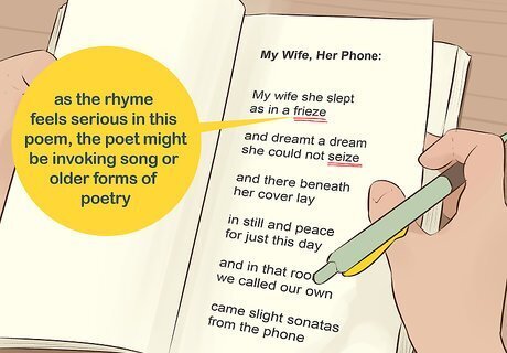 Establish the rhyme scheme for rhyming poems. In English poetry, most rhymes are "end rhymes," occurring at the end of lines in the poem. Identify these by writing a letter that stands for each different rhyme, such as ABAB for an alternating rhyme scheme. Check for internal rhymes, which happen within the line instead of at the end. These are common in spoken-word poetry. For the last century, it has become less common for poetry to rhyme. If you are reading a contemporary poem that rhymes, therefore, the poet is making an unusual choice. Think about why they are doing this: is the poem humorous? Is it inviting a comparison to song, or children's poetry? For instance, in this poem by David Brazil, "My wife she slept/as in a frieze/and dreamt a dream/she could not seize," the rhyme feels serious, not humorous, so that's your clue that the poet might be invoking song or older forms of poetry.