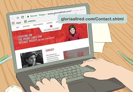 Write a letter if you prefer a more traditional approach. Sometimes the best way to express yourself is in a letter. If you would like to write to Ms. Allred, you can send a letter to either her Los Angeles or New York offices. The law firm's Los Angeles address is 6300 Wilshire Blvd., Suite 1500, Los Angeles, CA, 90048, c/o Gloria Allred. Write to Ms. Allred in New York at 305 Broadway, Suite 607, New York, NY 10007, c/o Gloria Allred.