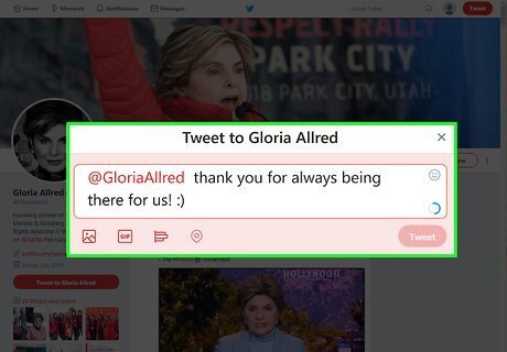 Send Ms. Allred a tweet if you're on Twitter. Gloria Allred maintains a steady presence on Twitter, where she posts updates on her cases and other important social justice issues. Although she doesn't accept direct messages from the public, you can use her page to send a tweet to her handle. While there's no guarantee that Ms. Allred will see your message, your chances of receiving a reply are higher if you have a thoughtful, insightful, or clever comment or question. You can find Gloria Allred's Twitter at https://twitter.com/GloriaAllred.