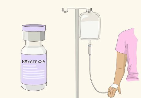 Discuss getting a pegloticase infusion if other medications don't work. If you have gout that doesn't respond to other treatments, ask your doctor about getting a pegloticase (Krystexxa) treatment. They will give you this medication as an IV drip. Pegloticase works by turning the uric acid in your blood into allantoin, a substance that your body can easily get rid of on its own. Pegloticase infusions can cause serious reactions in some people. Talk to your doctor if you experience side effects such as chest pain, coughing, difficulty breathing, dizziness, or facial swelling during or after a treatment.