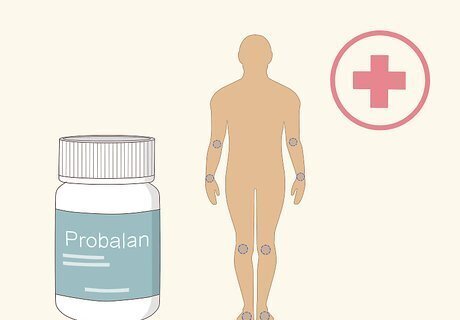 Look into medications that remove uric acid from your body. Some types of medications, called uricosurics, help remove uric acid that has already built up in your body. These medications are helpful if you have gout, but may increase your risk of developing uric acid kidney stones. Ask your doctor if uricosurics are a good option for you. Some common uricosuric medications include probenecid (Probalan) and lesinurad (Zurampic). Lesinurad must be taken along with medications that reduce your body's uric acid production. Talk to your doctor if you experience side effects such as a rash, stomach pain, or kidney stone symptoms.