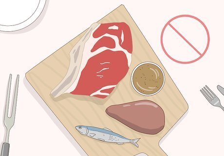 Avoid meats high in purines. Many meats contain purine, a natural substance that turns into uric acid in your body after you eat it. You can limit the amount of uric acid in your bloodstream by avoiding purine-rich meats, such as:Tip: Some vegetables, such as asparagus and spinach, are also high in purines. However, these have not been shown to increase the risk of gout and other uric acid-related conditions. Organ meats, including kidney and liver Meat extracts and gravies Red meats, including beef, lamb, and pork Some types of seafood, including anchovies, sardines, tuna, and shellfish