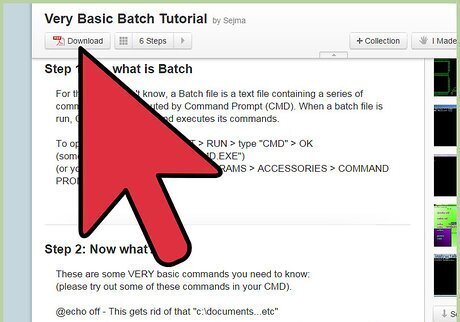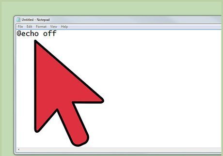 Learn some basic Batch codes. Batch is a script language; it contains numerous codes that cannot be learned in just one setting or one description. There are some basic codes, similar to DOS commands, however, that’s easy to keep in mind: ECHO — Displays text you entered after this code on the screen ECHO OFF — Hides the command output of each command given. REM — Inserts a comment line in the program PAUSE — Temporarily pauses the batch script. Press any key to move to the next command line. EXIT — Exits the Batch script.