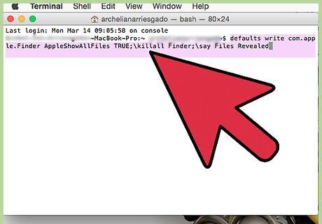 Type the following command into Terminal: “defaults write com.apple.Finder AppleShowAllFiles TRUE;\killall Finder;\say Files Revealed”