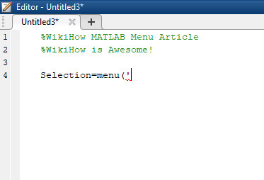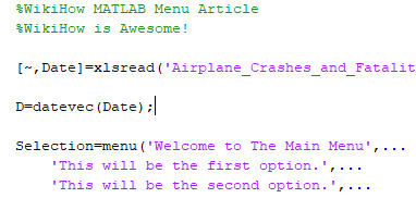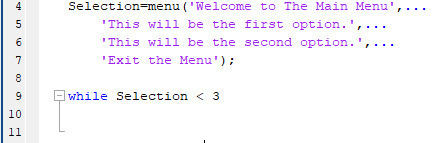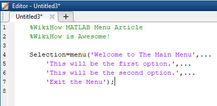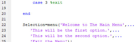 Determine the options you will need for your menu. These are called strings and need to have ' on either side of the names of the options. each is separated by commas. The first string will be the instructions to the user displayed above the menu options. You can put an ellipse (…) at the end of each option to move the option to the next line for easier reading. Remember to create an exit option so the menu can be terminated and end the line with a semicolon (;). Selection=menu('Welcome to The main Menu',...'This will be the first option.',...'This will be the second option',...'Exit the menu');