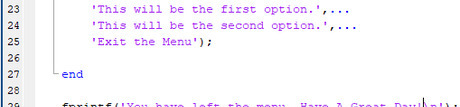 Add a fprintf statement letting the user know the program has ended. The \n at the end makes MATLAB skip to the next line in the command window. fprintf(‘You have left the menu. Have A Great Day!\n’); Bonus points for wishing them a good day.