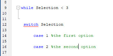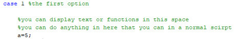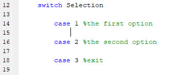 Create a switch case with the name of the menu. MATLAB may automatically indent this step if it does, do not worry the script will still work no matter how you indent the code. switch Selection