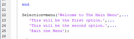 Copy and paste your menu function you created above below the line end. This allows the menu to be used again after it completes the option selected by the user. Another option or the same option can be now selected from the menu. Selection=menu('Welcome to The main Menu',...'This will be the first option.',...'This will be the second option',...'Exit the menu');