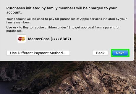Enter your credit card information and click Continue. This is required to add an Apple ID for a child, though your card will not be charged. If you already have a credit card associated with your account, it should appear here with only the last 4 digits visible.