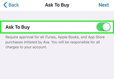 Make sure “Ask to Buy” is on and tap Next. When enabled, iTunes or App Store purchases your child attempts to make will require your permission.