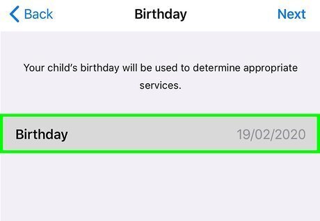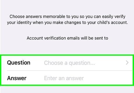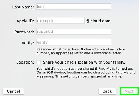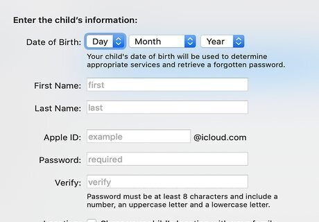 Enter your child’s information into the “Enter the child’s information” screen. Choose your child’s birthday from the dropdown menus. Type a new Apple ID (the username they’ll use to log into Apple products and services) for your child. Enter and verify a new password. Place a check next to “Share your child’s location with your family” so that you can find your child under Find my Friends. Click Continue.
