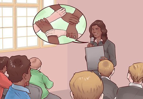 Publicize your club. Now that you have a club, make sure people know about it. There are a variety of ways to spread the word about a school club. For all of them, remember to include the name of your club, and the time and place of your first meeting. You can include other information if you want, but it needs at least that much. If people don’t know about your club and your meetings, they won’t know to attend. Post fliers around the school. Your school probably has lots of posters for different clubs and activities. Look for ways to help yours stand out and get people’s attention. You might try printing on recycled paper, green color paper, or posters with pictures of celebrities who care about environmental causes. If your school has rules about posters and fliers, make sure you know what they are, and that you follow all instructions. If your school does announcements in the morning, over a loudspeaker or a television, make sure your club gets a mention. Talk to the person who controls the announcements, usually the principal or a teacher, about how to make sure your message gets read to the school. A good way to get people’s attention is to give a presentation in front of them. You probably won’t get the whole school, so talk to your principal or teacher about giving an announcement in your homeroom or other classes. This will give students a chance to see you directly, rather than having your club announced with a bunch of other things in the morning. Another good way to spread the word is to have your members talk to a new potential member about the club and try to encourage them to come to the next meeting. You won’t get all of these people, but even a few new arrivals can help your club grow.