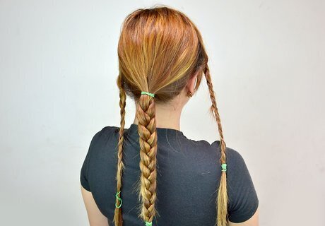 Place a hair tie at the base of the thick chunk of hair behind your shoulders to create a ponytail. Then braid the larger chunk as well and secure with a thin hair tie. You now have three braids.
