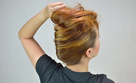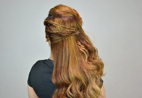 Grab a top layer of hair evenly from around your head, give it a small twist and pin it with a bobby pin just above the teased section on the side of your head.