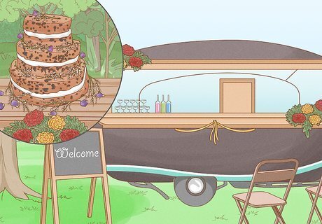 Use local and artisanal resources. Keep the carefree bohemian vibe going by serving non-traditional wedding food catered by a local company. Check out farmer’s markets for locally grown and organic vegetables, fruits, greenery, herbs and flowers. Consider doing away a formal sit-down dinner and setting up something more casual, like an outdoor buffet. Serve homestyle and fresh foods. Check out artisan bakeries in your area for boho-inspired weddings cakes. Look into boho-inspired food trucks to cater the food in an outdoor setting.