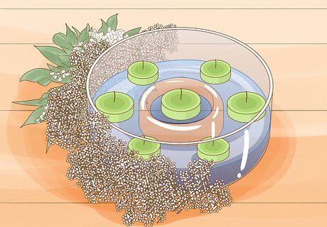 Create artistic and unusual floral focal pieces. Arrange the flowers of your choice in mason or apothecary jars for a rustic, pastoral vibe. Create high drama on a budget by putting together large fluffy arrangements of baby’s breath and herbs and placing them in vintage cocktail glasses. Adorn the tables with lanterns and candles. Fill tall glass vases with water and submerge sprigs of baby’s breath in them to create a unique look. Float tealights in the water and light them before the guests arrive. Do away with conventional vases altogether and fill vintage glass bowls or other vessels with water and float the blooms of your choice on the water’s surface. Another alternative is running fresh green garlands down the length of the tables. Weave or tuck the flowers of your choice into the garlands.