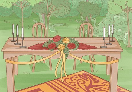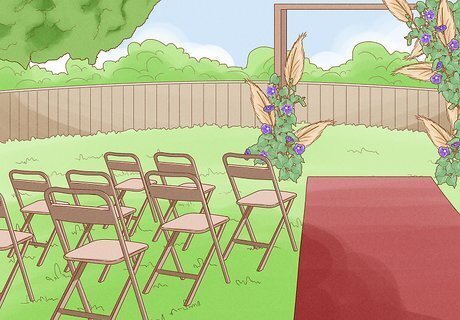 Keep the décor simple and natural. Use as many organic details as possible. Decorate with floral wreaths, garlands, potted plants and lush greenery. Select accents made of natural materials like burlap and wood. Look into a nature-themed ceremony arch, which can be woven with ivy, fresh herbs and fern sprigs. Embellish with simple florals like baby’s breath, daisies and roses. Line the ceremony aisle with plants or flowers that match your wedding theme. You could also cover the aisle ground with rose petals, fresh herbs or wildflowers for you to walk over. Incorporate delicate accents such as lace, silk and velvet ribbons in muted pastel colors.