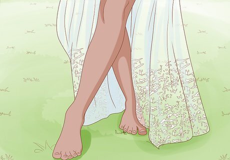 Go barefoot. High heels typically do not compliment a boho style bridal gown – a laid-back dress calls for carefree footwear. Many boho weddings are held at outdoor venues, with a ground covering of soft grass or sand, so going barefoot works well in these situations. You can have your bridal party go barefoot, as well, to complete the intimate atmosphere and lighthearted look. If you prefer to wear shoes, stick to simple designs. Flats and delicate sandals work well, but the ultimate decision should be made based on the design of your dress.