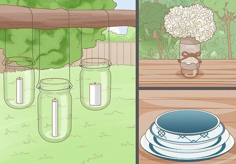 Mix and match rustic details and vintage designs. Boho style makes use of eclectic details that can be mixed and matched to great effect. Try using an assortment of vintage serving plates and dishes that feature different patterns but share a color scheme. Combine different kinds of prints and fabrics – mosaic prints are popular, as are paisleys. Blend multiple styles with an assortment of different colors. Incorporate vintage-inspired details like mason jars, apothecary jars, regular lanterns, paper lanterns and string lights featuring old-fashioned Edison bulbs. Accent with velvet, burlap, twine, ribbon, lace, dried flower bundles and floating tealight centerpieces.
