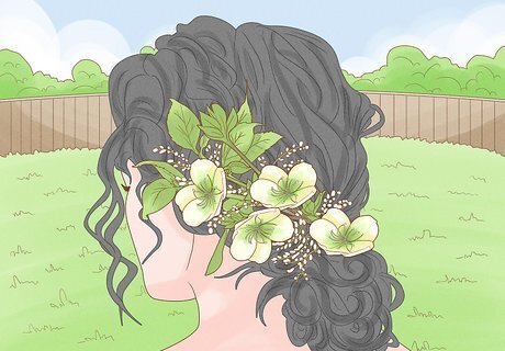 Wear flowers in your hair. Floral crowns made of baby’s breath, daisies, lavender sprigs and delicate greenery are extremely popular and symbolize the boho spirit. Depending on your personal style and dress, you could wear a subtle circlet or something more ornate for your crown. You could do something even simpler, such as tucking sprigs of baby’s breath or wild flowers into a loose and somewhat “undone” hair style. Try adorning braids and up-dos with fresh herbs and daisies. More intricate fabric headpieces with floral details are also popular.
