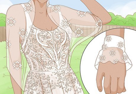 Seek out delicate accessories. Graceful and eclectic accessories, like lace shrugs and simple fabric cuffs, are popular with boho brides. Look for dainty embellishments like silk rosettes, feathers, crystals, pearls and filigree. Vintage jewelry works well for creating a boho style, but keep your pieces minimal and simple. Don't overwhelm your gown with loud accessories. Consider a veil with an unconventional design and soft, lacy fabric. Depending on your dress and personal style, you can even opt for an ultra-relaxed, no-jewelry look.