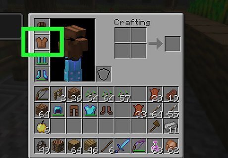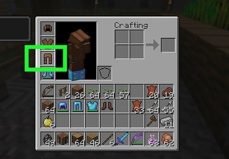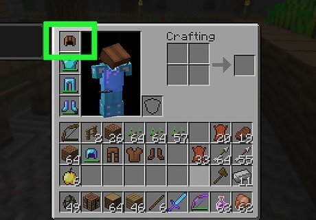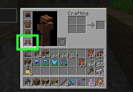 Put on your leather helmet. Next to your 2x2 grid, you should see an image of you, with four boxes next to it. Those boxes are where you will equip your leather armor. First, you’ll need to equip your leather helmet. To equip your leather helmet, clicking on it. It will be located in your inventory (the bottom). Once you’ve selected your leather helmet, drag it to your boxes next to the image of you. Put the leather helmet in the top box. In the image of you, you should be wearing the all-new leather helmet.