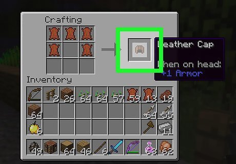 Craft your leather helmet. Select your leather from your inventory, and bring it to your 3x3 grid. To make a leather helmet, place three pieces of leather in the top row of your crafting grid. Put one leather piece in the box to the left in the middle row, and one in the box to the right in the middle row. Your leather helmet should appear in the result box. Put it into your inventory.