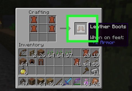 Craft your leather boots. Select and put your leather materials in the top-left, top-right, middle-left, and middle-right boxes of your crafting grid. Your leather boots should appear in your result box. Put it into your inventory.