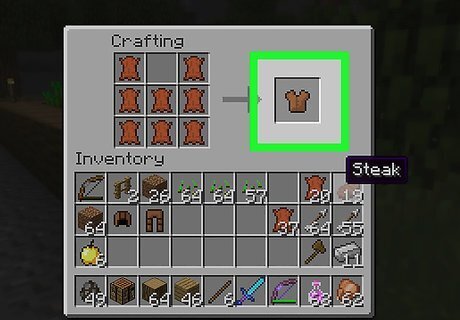 Craft your leather breastplate. Select your leather again, and place them in all but the box in the middle of the top row of the grid. Your leather breastplate should appear in the result box. Put it in your inventory.