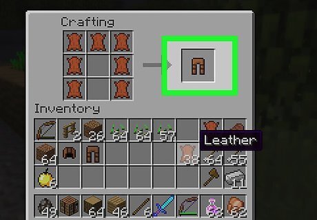 Craft your leather leggings. Select your leather again, and put them in all but the box in the middle of the middle row, and the one in the middle of the bottom row in your grid. Your leather leggings will appear in the result box. Put it it in your inventory.