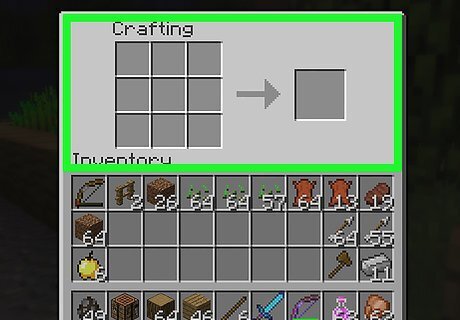 Open your crafting area. Your crafting area is where you will craft your crafting table. To open up your crafting area, press E on your keyboard. You should see a 2x2 grid on the top right. Above the grid, it should say the word “Crafting” on top. This is your crafting area.