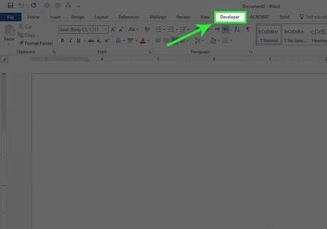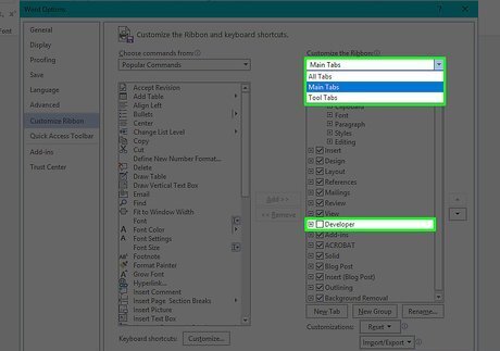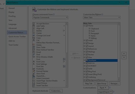 Check the "Developer" box. This box is near the bottom of the "Main Tabs" list of options. Depending on your selected program, you may first have to place your cursor in the "Main Tabs" pane and then scroll down to find the "Developer" box.