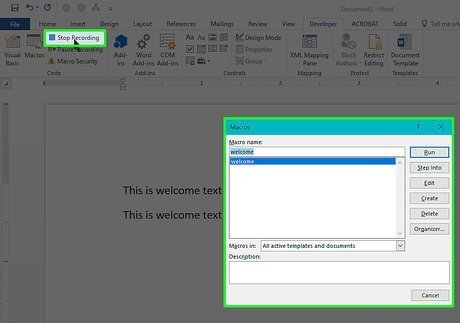 Click Stop Recording. It's in the Developer toolbar. This will save your macro and add it to your document's macro list. You can implement the macro by clicking Macros, selecting your macro's name, and clicking Run.